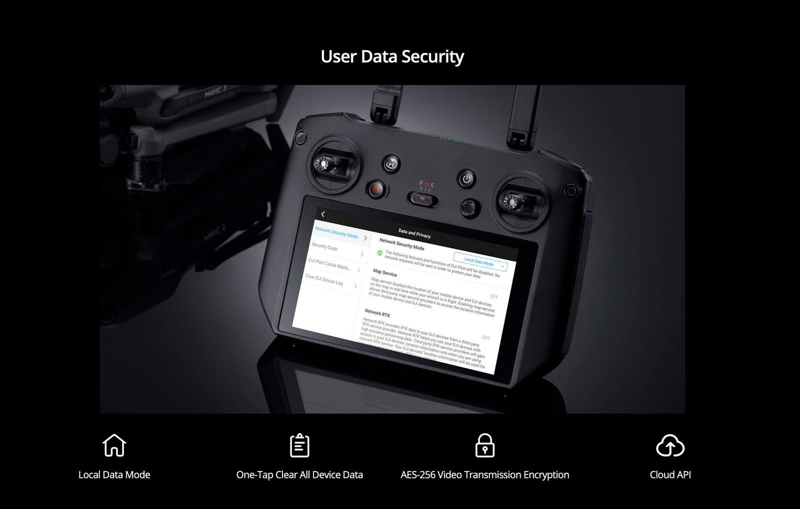 DJI will not access any user data unless the user grants DJI permission to do so. Users can choose to grant or revoke permissions anytime in the "Network Security Mode" settings. Such permissions include access to device information, flight records, device logs, approximate location information, user experience improvement program information, and whether DJI can share your device location with third-party map service providers in order to display your location on the map. You can enable "Local Data Mode" to use your device completely offline. In this case, you do not need to log in to your DJI account. Installer packages to upgrade your device can be downloaded directly from the DJI website. Soon, we will release features such as custom offline maps and offline import of certificates to unlock restricted zones.Data Encrypted for Enhanced SecurityData transmitted between the drone and the controller on the ground is protected by the AES-256 encryption algorithm. The communication between the DJI Pilot app and the server is also protected by HTTPS or WebSockets over SSL/TLS (WSS) protocol to prevent hijacking by third parties.Secure Device Media StorageDJI Mavic 3 Enterprise drones support a password protection mechanism for onboard data storage to guarantee the security of sensitive images and resources. When the password function is enabled, data stored in the SD card or onboard storage can be accessed only after the user-defined password is provided. The user-defined password is not shared with DJI, which means DJI cannot retrieve this password if you forget it.